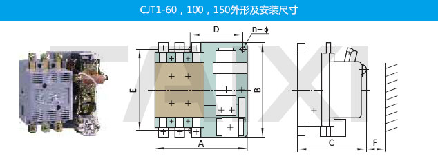 本接觸器的結(jié)構(gòu)及安裝尺寸與CJ10相同。滅弧罩由耐弧塑料弧罩和鐵柵片組成,CJT1-60、100、150的底座用增強(qiáng)塑料制成。