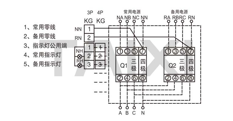接線時,常用電源N應接入常用電源執(zhí)行斷路器QN,備用電源R應接入備用電源執(zhí)行斷路器QR。當QN和QR為四線斷路器時,接線方式按接線圖,其中QN和QR的1、3、5為三相(A、B、C)進線端,2、4、6為三相出線端,7為零線(N)進線端,8為零線出線端。若選用斷路器為三極斷路器,則必須將常用電源(N)的零線NN和備用電源(R)的零線NR同時接到三極專用接零線端子KG上。具體操作見接線圖。雙電源切換開關自動控制器的工作電源取斷路器QN和QR的進線端A相和零線N,若選用斷路器為三極斷路器時,必須要接零線NN和NR,該三極專用接線零端子在兩臺斷路器中間,在自動電源切換開關安裝,接線過程中,切不要把原接在斷路器進線端的本機控制器線忘掉,碰斷或短路等。